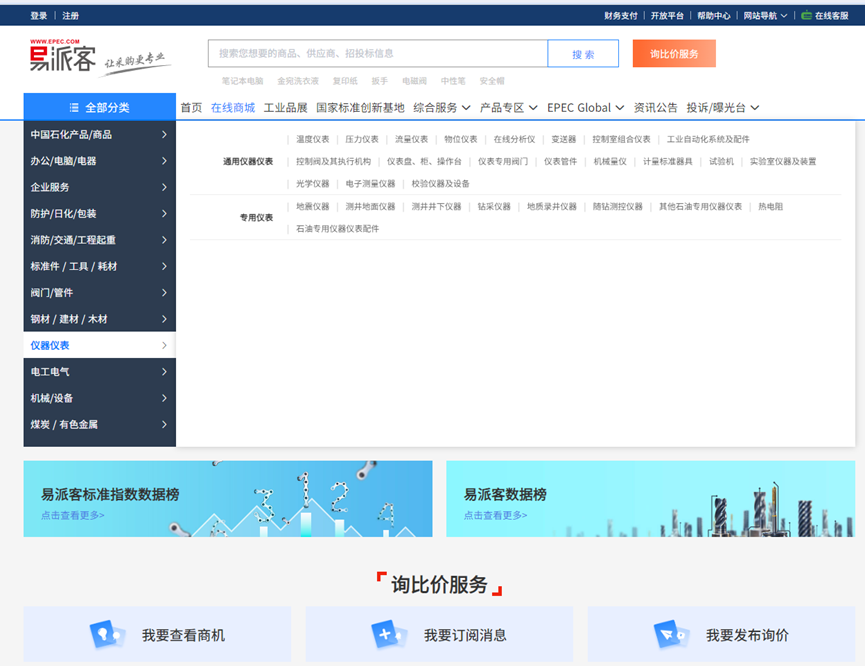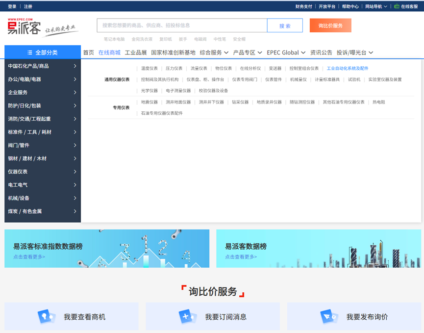 方法二:百度搜索易派客官网或登录易派客网址https://emall.epec.com/点击在线商城,在左侧全部分类里面找到仪器仪表,在仪器仪表子目录里面找到工业自动化系统及配件点击后在供应商栏找到4008云顶国际集团即可找到公司上传的所有产品及参考价格(示例如下图)。